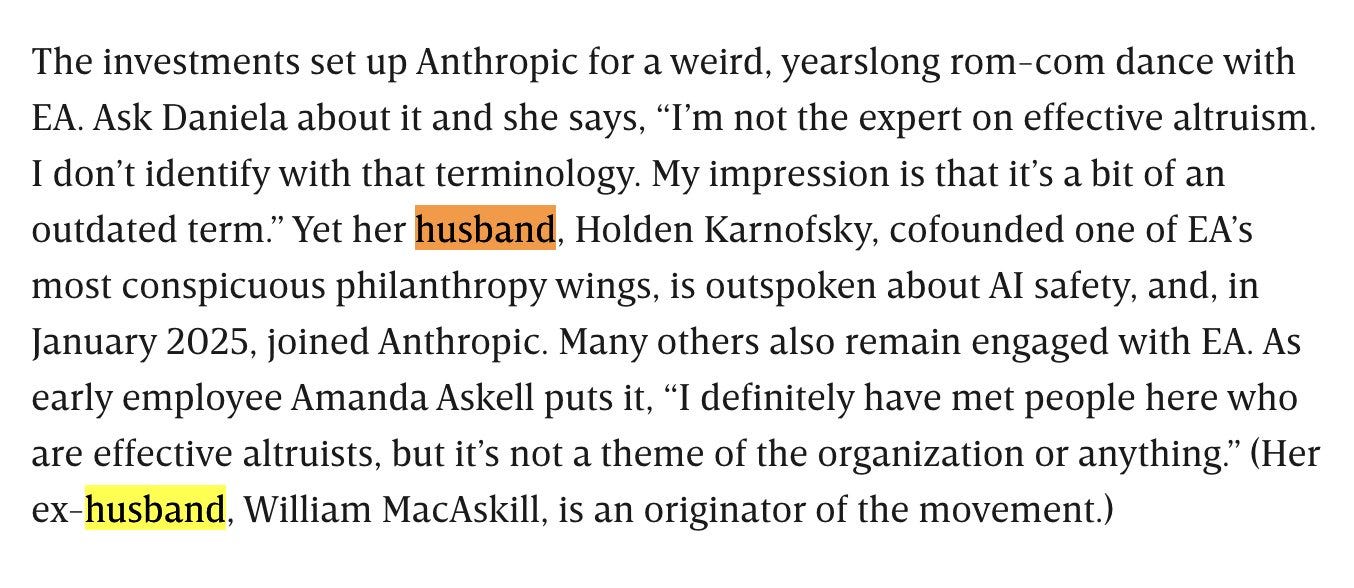 For context, Will MacAskill and Holden Karnofsky are arguably, literally the number one and two most prominent Effective Altruists on the planet. Other evidence of their ~spouses’ personal involvement abounds, especially Amanda's. Now, perhaps they’ve had changes of heart in recent months or years – and they’re certainly entitled to have those – but being evasive and implicitly disclaiming mere knowledge of EA is comically misleading and non-transparent. Calling these statements lies seems within bounds for most.[1]