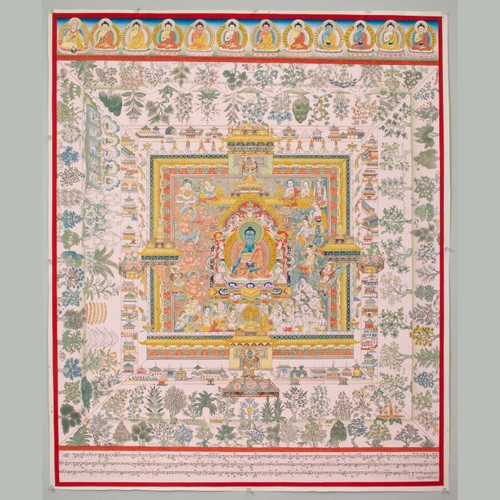 Artwork: Medicine Buddha Palace (Copy of First Painting from the Set of the Tibetan Medical Paintings from Mentsikhang Lhasa); Rebgong county, Qinghai Province, China; 2012-2013; pigments on cloth; Rubin Museum of Art;