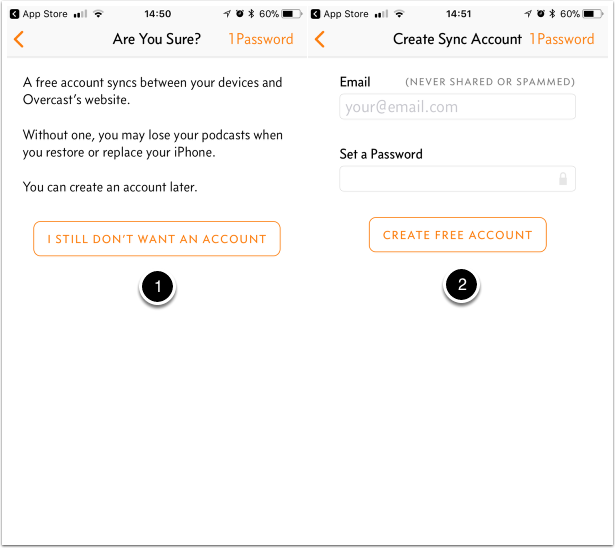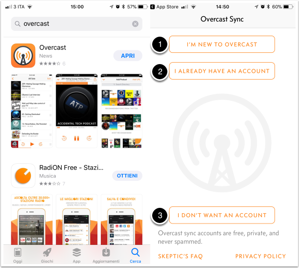 Nell'ipotesi in cui non vogliate creare l'account vi verrà fatto la richiesta ulteriore di conferma (immagine sottostante punto 1). Nel caso invece abbiate deciso di creare un account vi verrà richiesta l'immissione di una email e di una password. Da mia esperienza personale non ho ricevuto email fastidiose da Overcast. Vi consiglio quindi la seconda opzione.