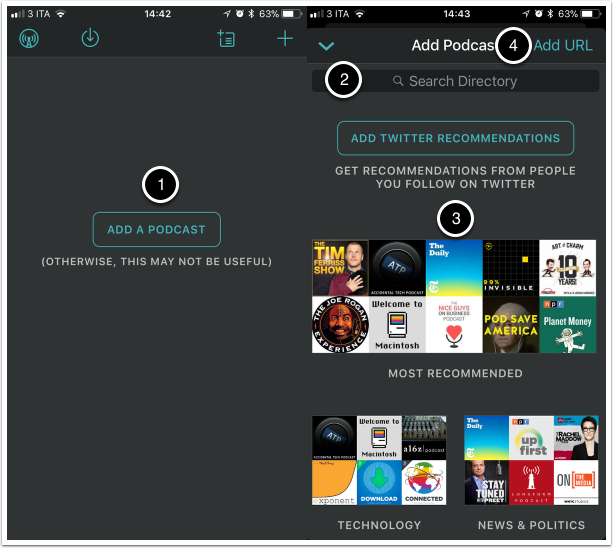 Potete Aggiungere un URL (punto 4), se lo conoscete (maggiori informazioni sotto), cercare in una directory ovvero un elenco di podcast come è ad esempio iTunes, digitando il nome del podcast (punto 2) ed infine scegliere tra le raccomandazioni di Overcast (punto 3). Sono tuttavia prevalentemente podcast in lingua inglese.