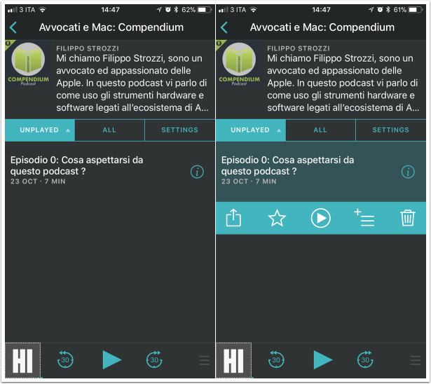 Se vi siete iscritti al podcast, ora potete ascoltarlo in Overcast. Per riprodurre una puntata (unplayed – non ascoltata) basta premere col dito sull'episodio e si espanderanno le opzioni, il tasto play serve per riprodurre l'episodio.