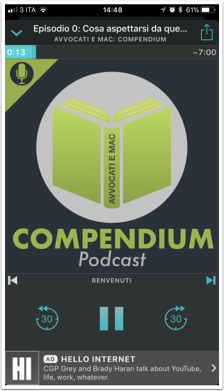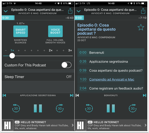 Una delle cose piacevoli di Overcast è la possibilità di mandare avanti o indietro di 30 secondi le puntate di un podcast, o passare velocemente tra un capitolo e l'altro (se il podcast che state ascoltando è dotato di capitoli).