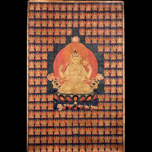 Artwork: Avalokiteshvara (Bodhisattva and Buddhist Deity)—Chaturbhuja (Four Hands); Tibet; 18th century; ground mineral pigment, fine gold line on cotton; Rubin Museum of Art;